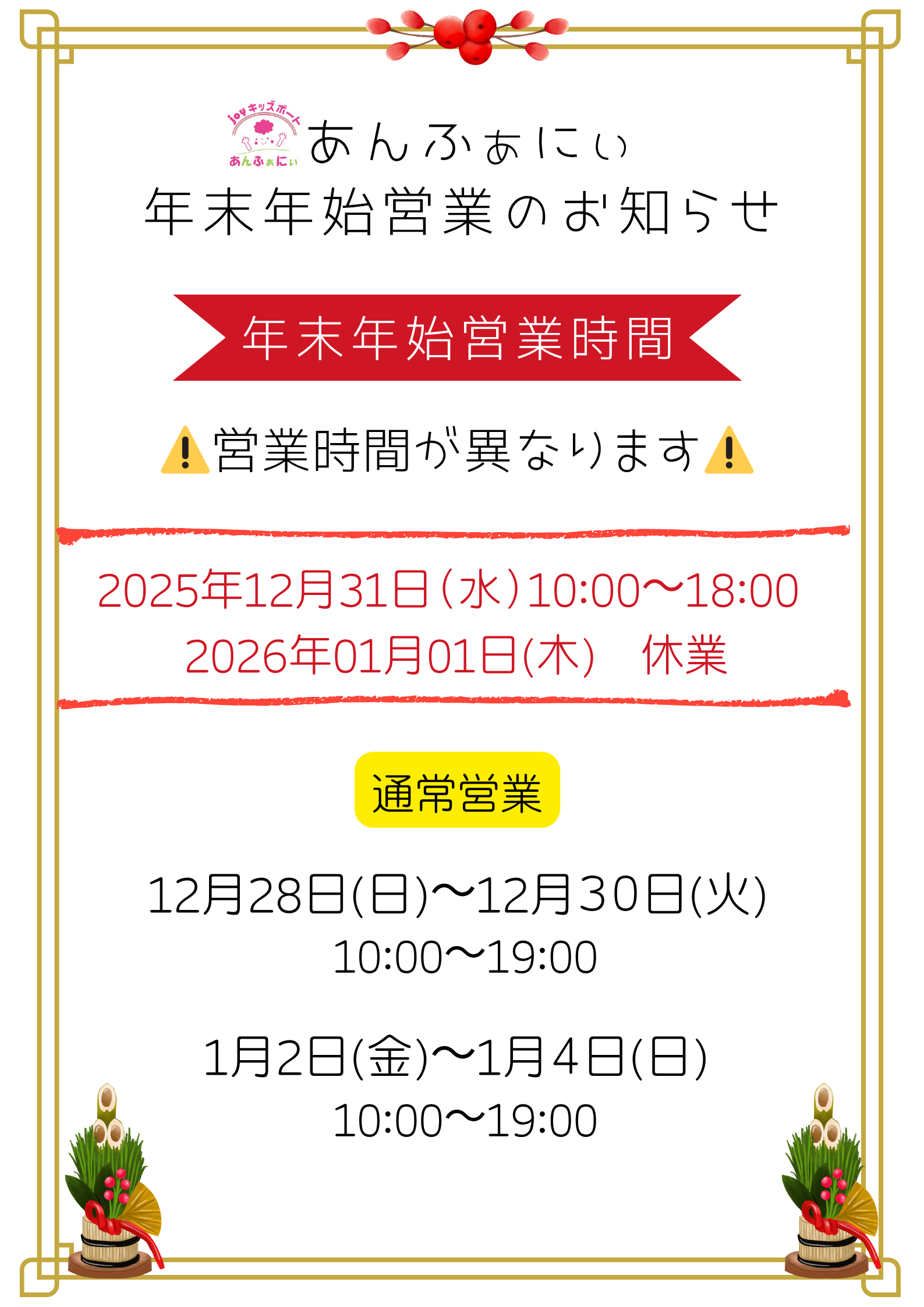 ※1月1日(木)は【 あんふぁにぃ 】お休みになります。